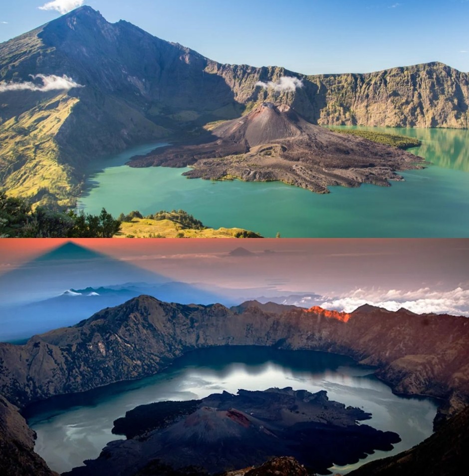 Puncak gunung ini menawarkan pemandangan spektakuler, termasuk lautan awan, hutan hijau, dan Danau Segara Anak.