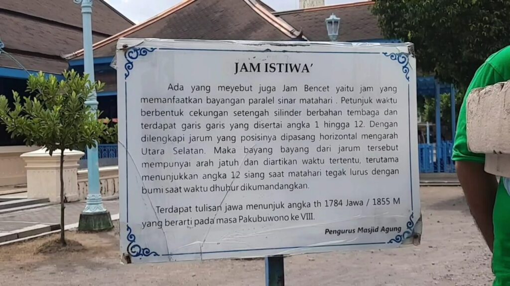 Solo, echannel.co.id, Sebelum zaman modern, umat Muslim menentukan waktu salat dengan melihat posisi matahari. Salah satu alat yang digunakan adalah jam matahari, yang masih bisa ditemukan di Masjid Agung Surakarta. Jam matahari ini, yang dikenal sebagai Jam Istiwa atau Bencet, merupakan peninggalan dari masa pemerintahan Pakubuwono VIII.